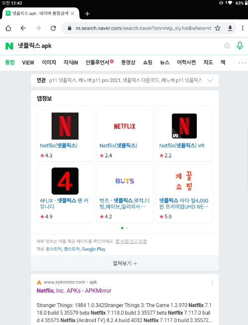 네이버에 검색하면 사진 맨아래 Netflix, Inc. APKs-APKMirror 여기 링크가 보이실 텐데요. 방금 말씀드린 그 링크를 클릭하여 사이트에 접속하시면 됩니다.